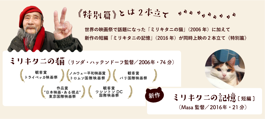 世界の映画祭で話題になった「ミリキタニの猫」(2006年)に加えて新作の短編「ミリキタニの記憶」(2016年)が同時上映の2本立て《特別篇》